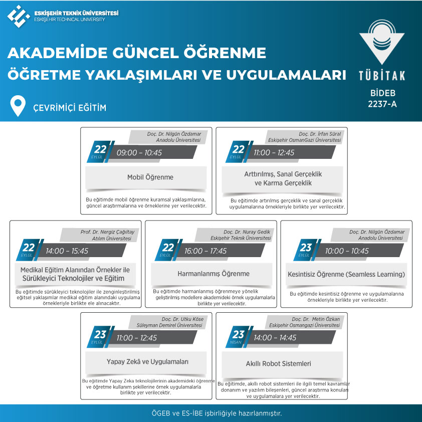 Eskişehir Teknik Üniversitesi Öğrenme ve Öğretme Gelişimi Birimi bünyesinde ES-İBE işbirliğiyle TÜBİTAK BİDEB 2237-A programı kapsamında desteklenen “Akademide Güncel Öğrenme -Öğretme Yaklaşımları ve Uygulamaları” etkinliği 22-23 Eylül 2023 tarihleri arasında çevrimiçi olarak gerçekleştirilecektir.